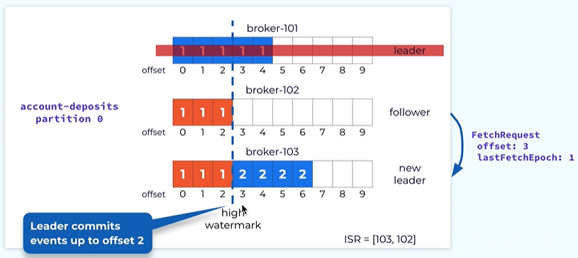 So the leader will send a response indicating to the followers to make the log consistent with respect to epoch 1. in this case epoch I really ends before offset 3. When the following receives this fetch response from the leader it will know that it needs to truncate the data at the after 3 and four at this point and at this point the data is consistent with the leader up to offset 2.
